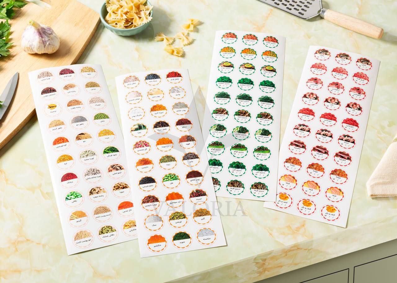 هر برگ حاوی 30 عدد برچسب برای چسباندن روی سبزیجات، ادویه جات، حبوبات و پروتئین است.