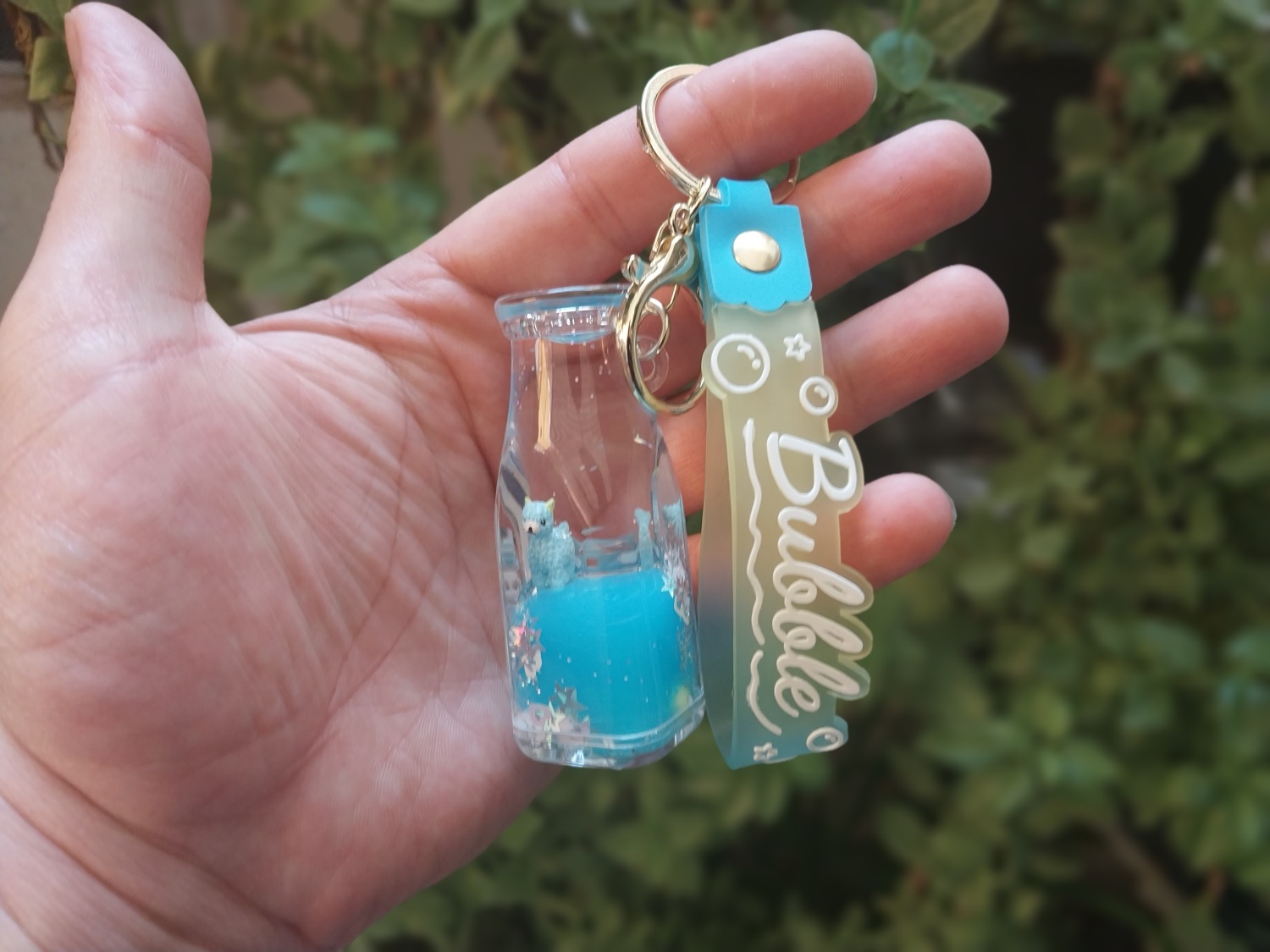 داخل مایع جاکلیدی آبی، عروسک لامای کوچکی وجود دارد.