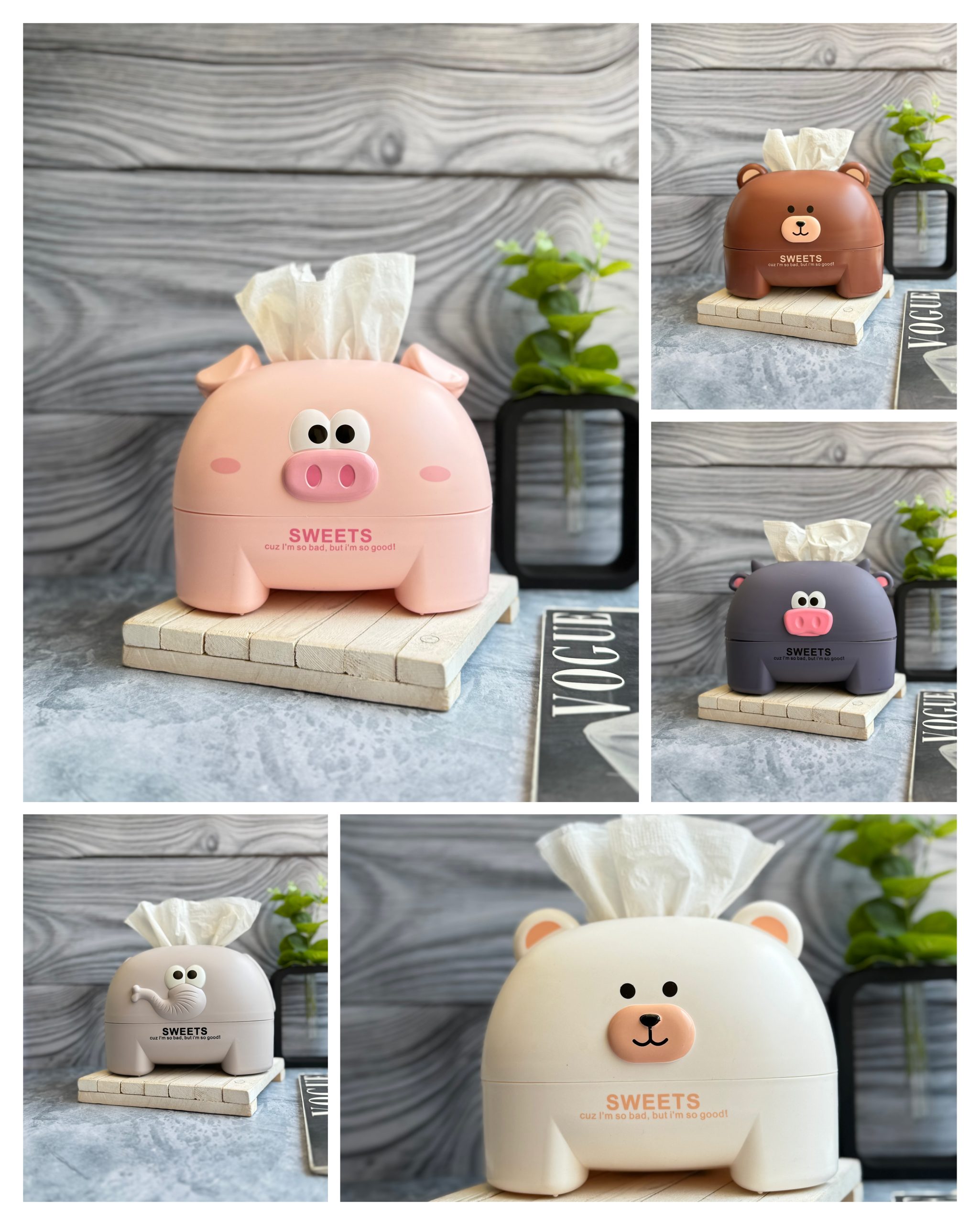 | طرح | خرس سفید, خرس قهوه ای, فیل, خوک صورتی, گاو سرمه ای |