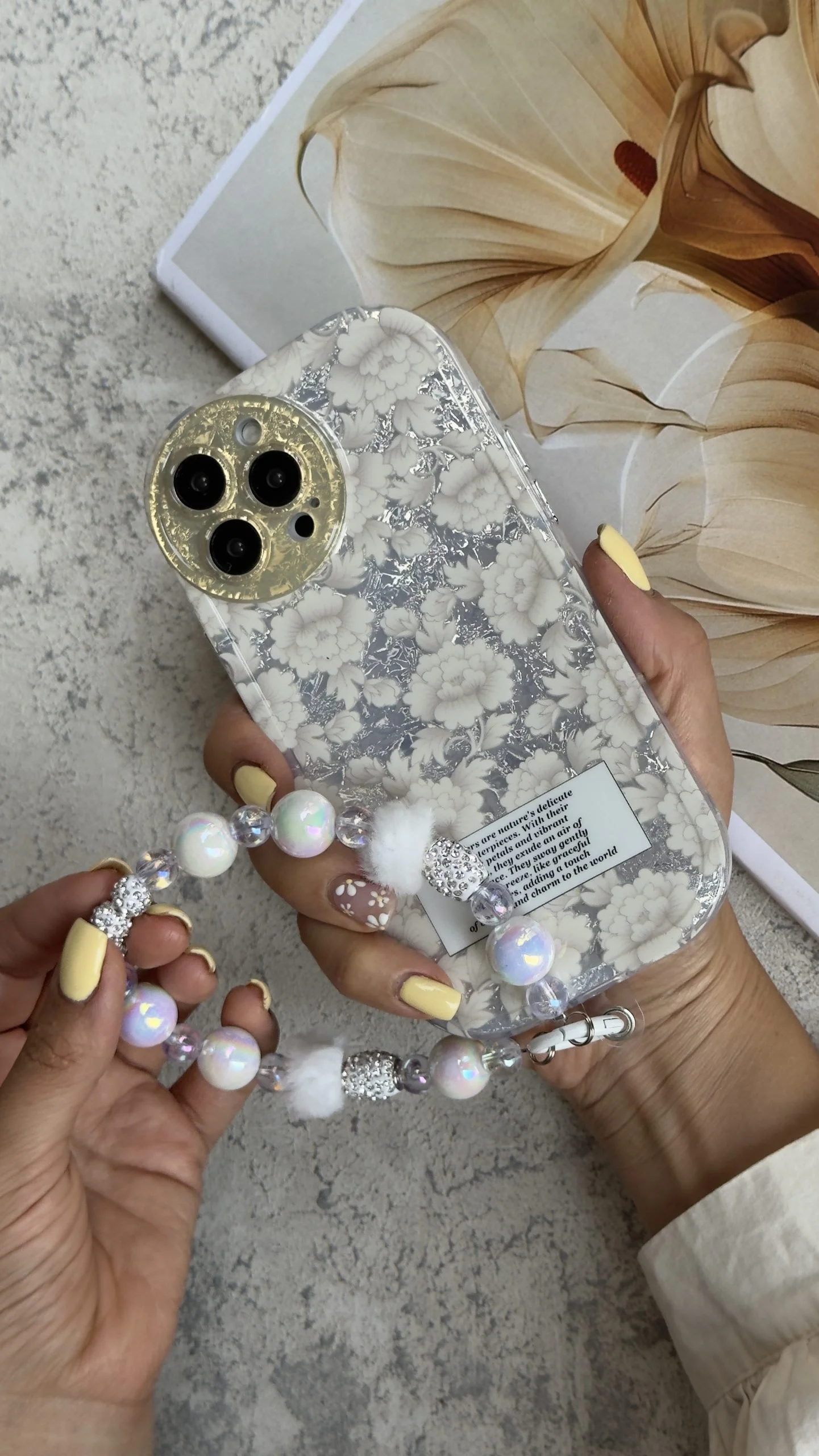 قاب آیفون گل مستر پیس سفید نقره ای + بندست مخملی
