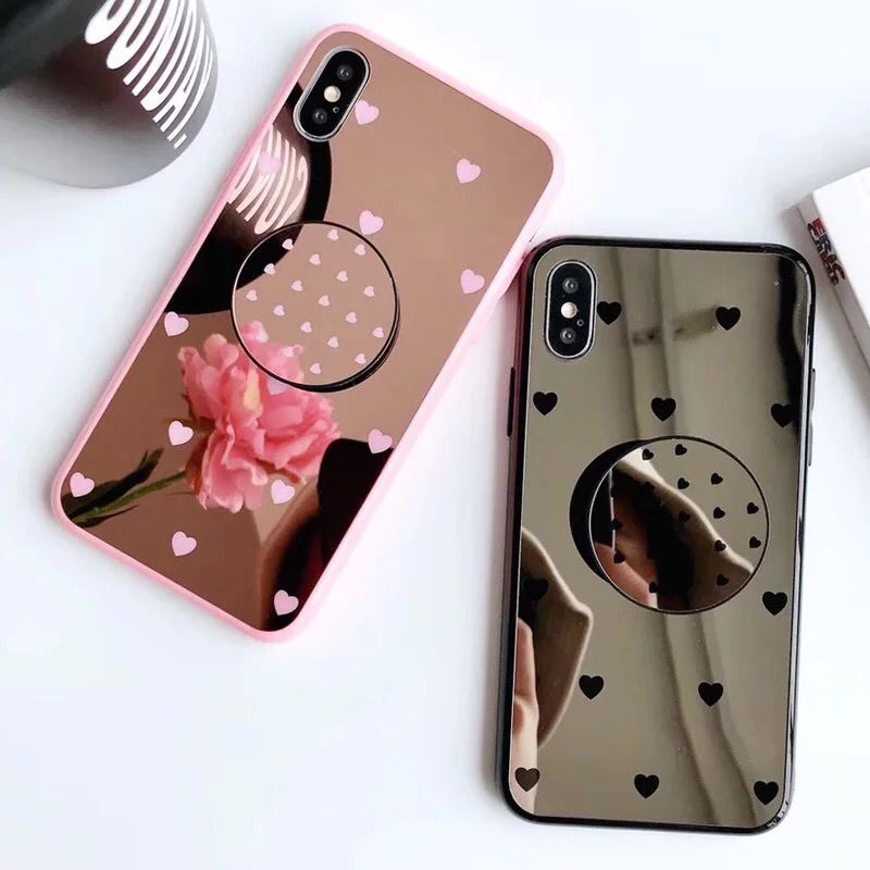 قاب قلب ریز آیینه ای مشکی و صورتی همراه با پاپ سوکت