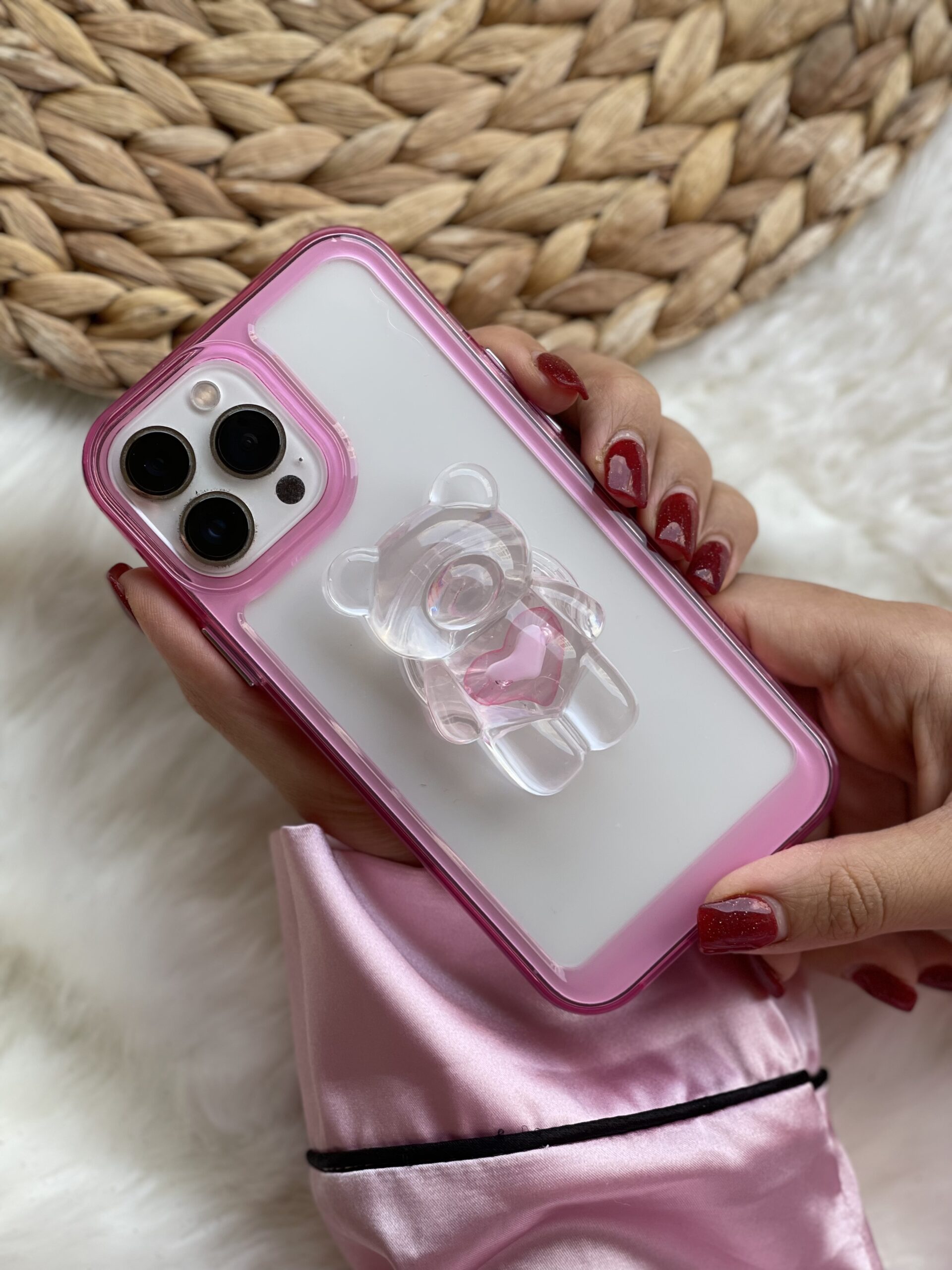 قاب موبایل آیفون خرس کریستالی صورتی + پاپسوکت خرسی